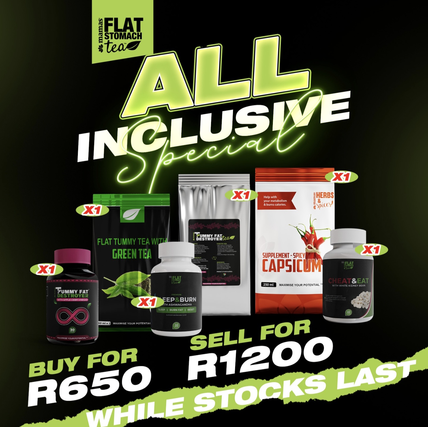 What's included: X1 GREEN TEA + X1 CAPSICUM SUPPLEMENT + X1 TUMMY FAT DESTROYER TEA + X1 CHEAT N EAT X1 TUMMY FAT DESTROYER CAPSULES + X1 SLEEP AND BURN